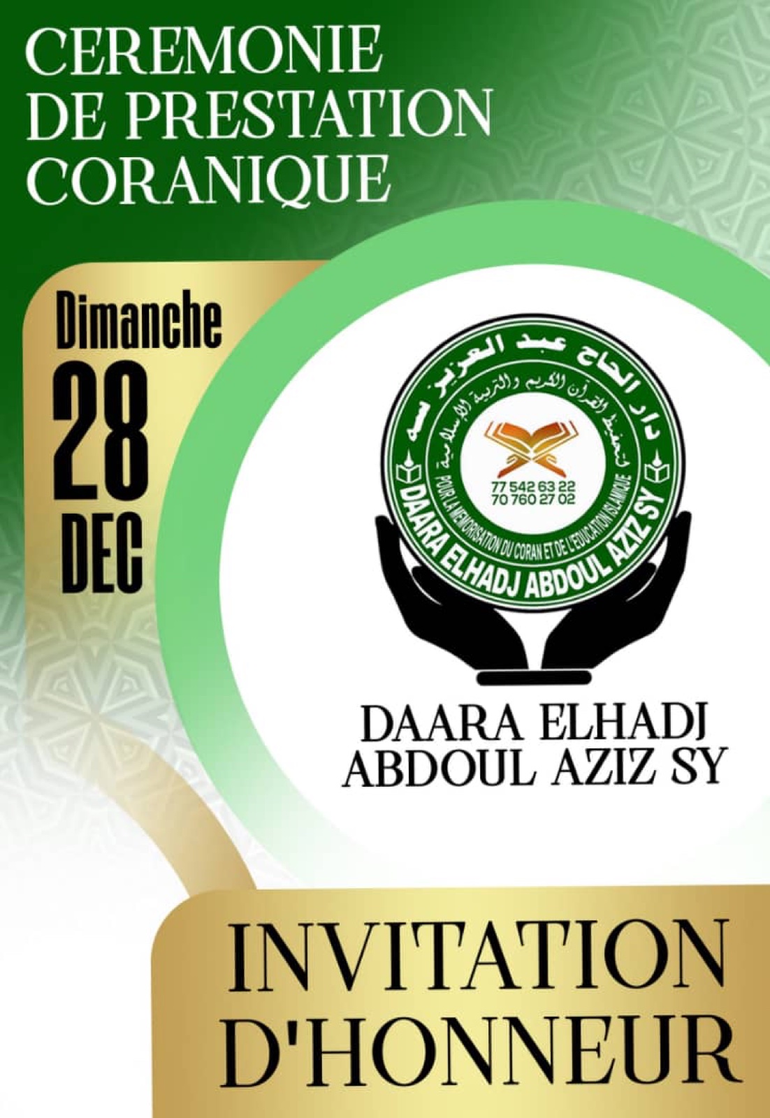 Sous le ndigël de la famille Sy, le Daara perpétue depuis Tivaouane l'enseignement initié par El Hadj Malick Sy. Mémorisation du Saint Coran, transmission de la Sunnah, et formation spirituelle dans la pure tradition de la Tijaniyya.